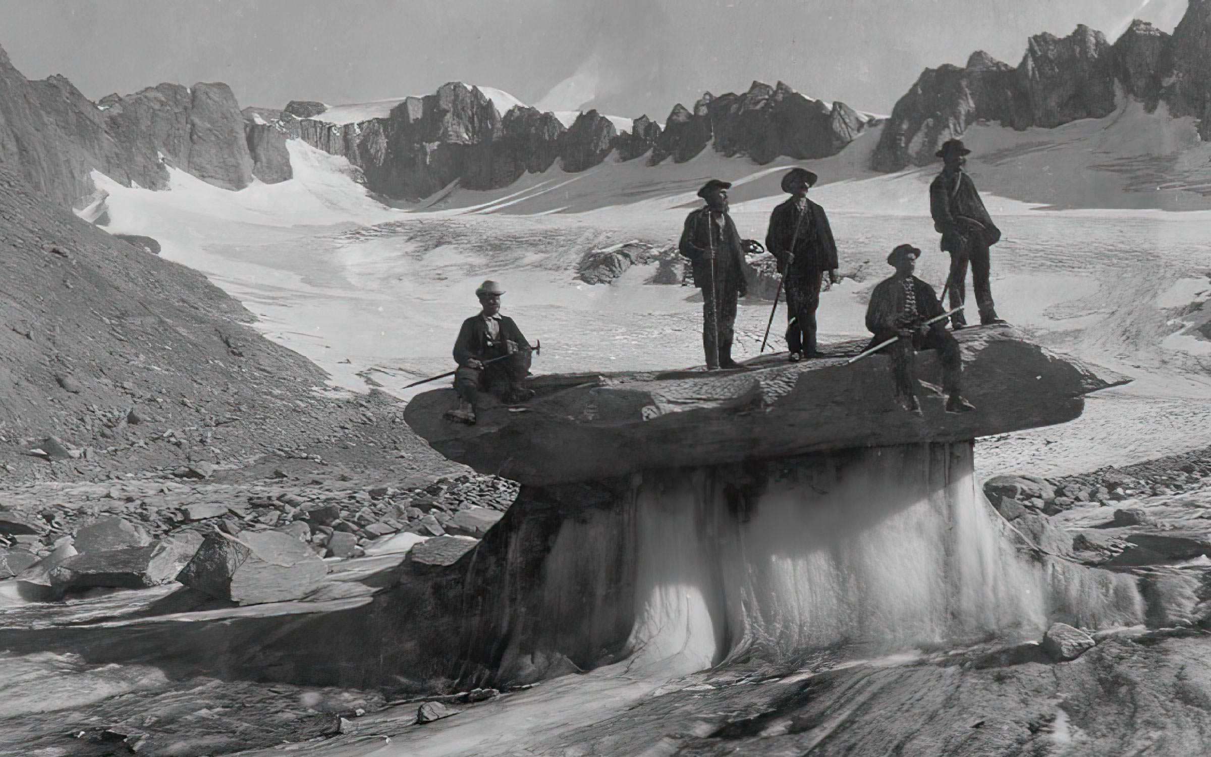 Heinrich Wild, left, at the Rhône Glacier in the Swiss Alps, 1901.